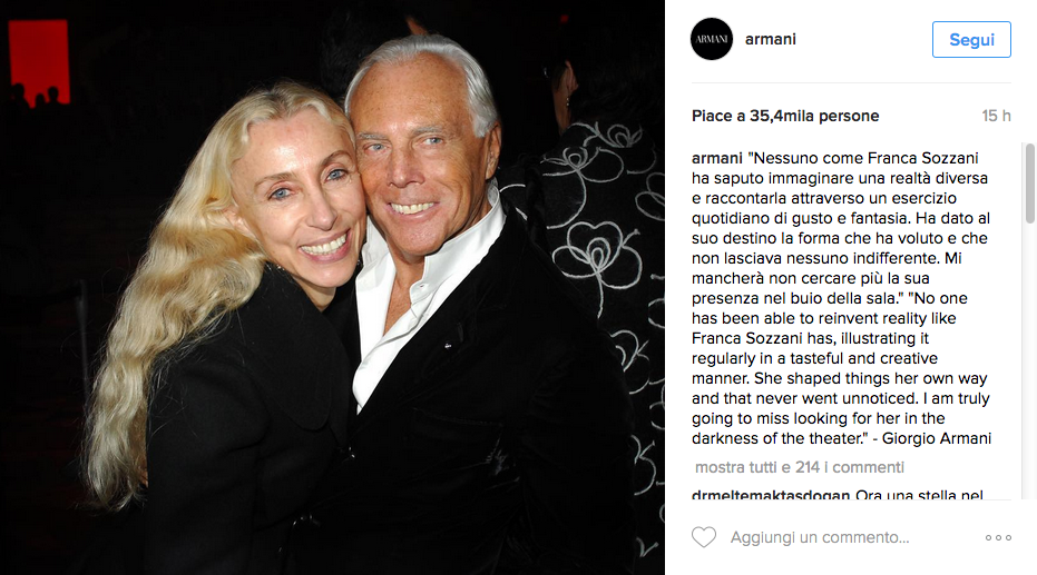“Nessuno come Franca Sozzani ha saputo immaginare una realtà diversa e raccontarla attraverso un esercizio quotidiano di gusto e fantasia. Ha dato al suo destino la forma che ha voluto e che non lasciava nessuno indifferente. Mi mancherà non cercare più la sua presenza nel buio della sala”. Parola di Giorgio Armani che, con queste parole, ha voluto rendere omaggio a Franca Sozzani, storica “Direttora” di Vogue Italia scomparsa il 22 dicembre a 66 anni dopo aver lottato un anno contro il cancro.
