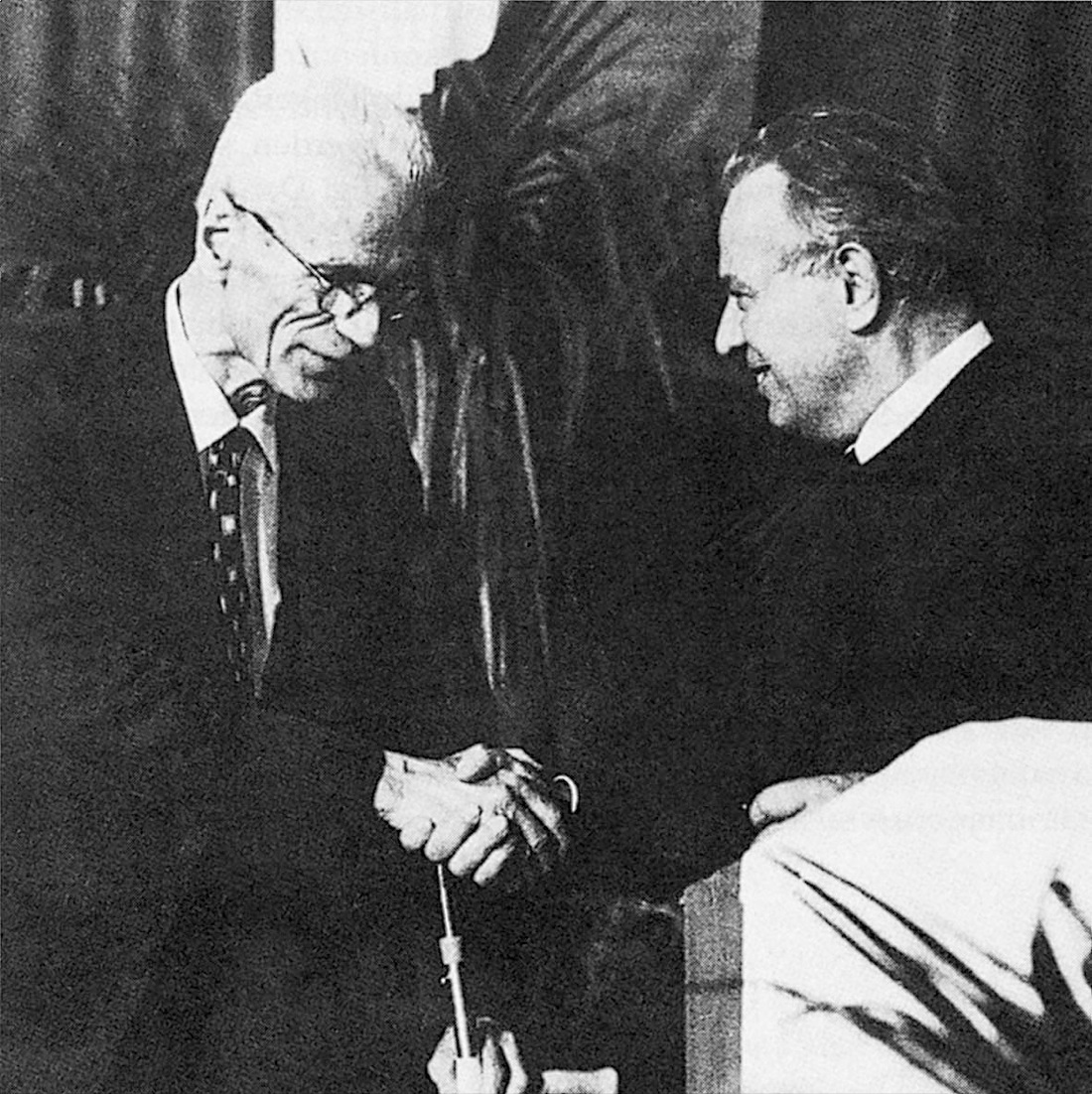 Stretta di mano fra Silvius Magnago (sin.) e Peter Brugger (ds.) dopo la votazione sul “Pacchetto” il 22 novembre 1969