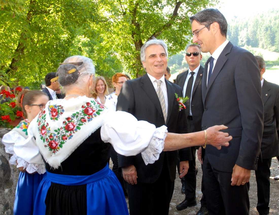Il cancelliere austriaco Werner Faymann (c), con l’attuale Presidente altoatesino Arno Kompatscher (d), a margine del convegno “Regioni in Europa – Europa delle regioni”, organizzato a Castel Presule (BZ), 5 luglio 2014.