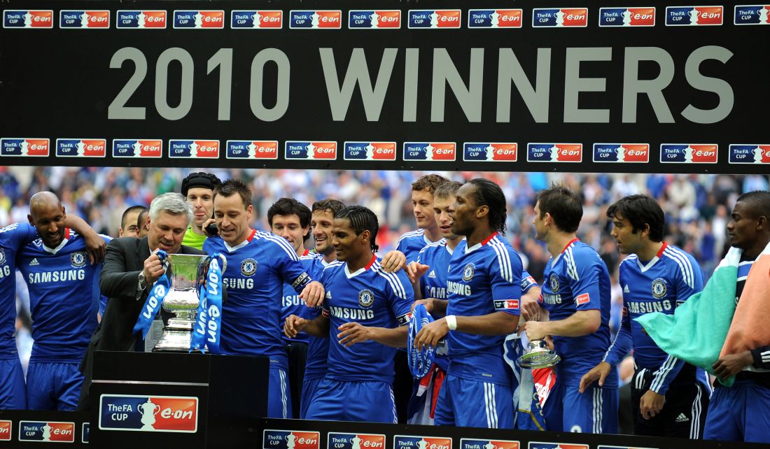 Ancelotti solleva il trofeo della Premier League 2009-10 vinto alla guida del Chelsea