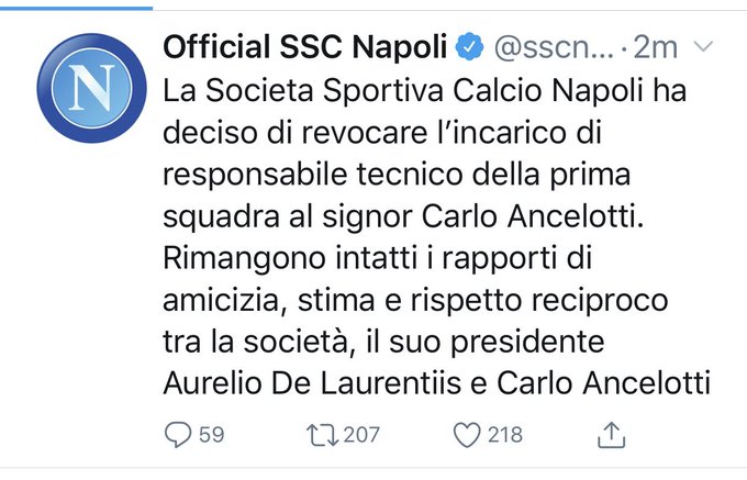 Se è vero che la grandezza di un allenatore non si misura dai suoi insuccessi, Carlo Ancelotti può dormire tranquillo. Resta e resterà un tecnico record anche dopo l’esonero deciso dal presidente del Napoli De Laurentiis e comunicato poche ore dopo il successo al San Paolo contro il Genk che ha sancito la qualificazione agli ottavi di finale della Champions League.