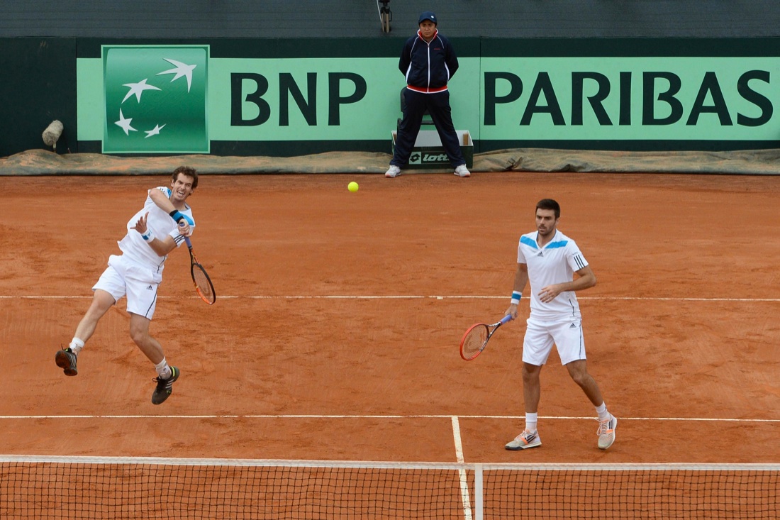 Colin Fleming e Andy Murray contro Fabio Fognini eSimone Bolelli nel doppio durante i quarti di finale della Davis a Napoli nel 2014