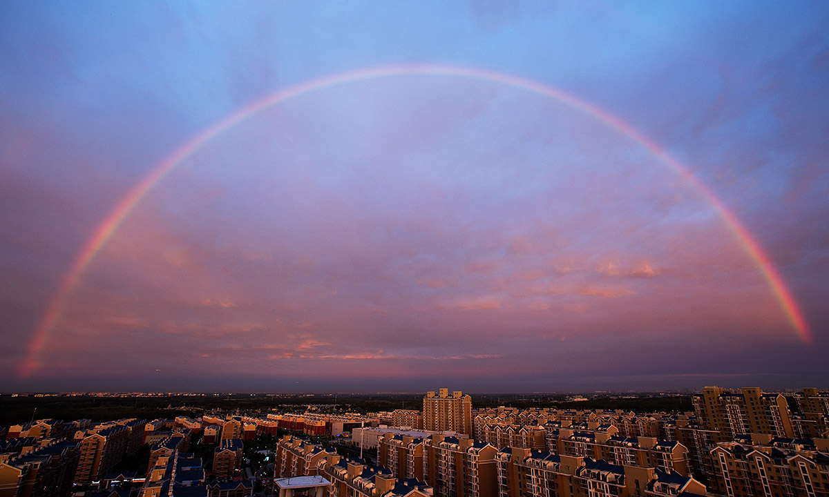 Dopo una leggera pioggia che ha portato sollievo dalla calura agli abitanti di Pechino, nel cielo della capitale cinese è comparso oggi, poco prima del calar del sole, uno splendido arcobaleno. Alle tinte dell’arco multicolore hanno poi lasciato spazio i rossi infuocati del tramonto e i blu intensi della notte.