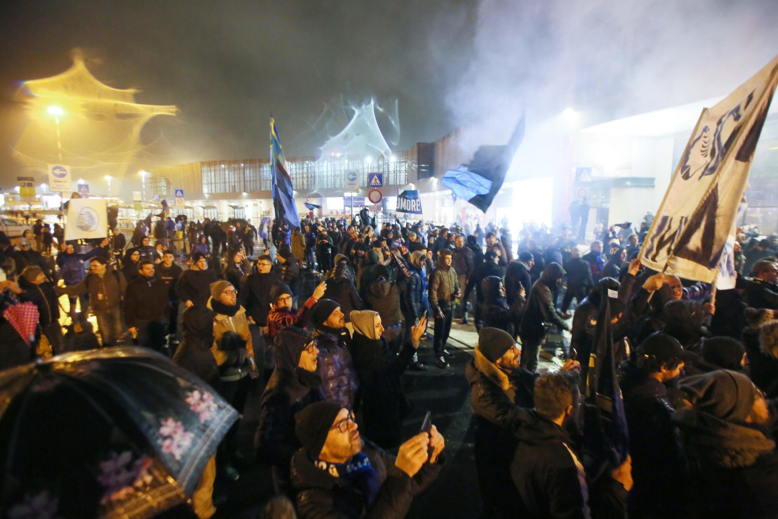 La festa dei tifosi dell’Atalanta all’aeroporto di Orio al Serio per l’arrivo della squadra che ha passato il turno qualificandosi agli ottavi di Champions