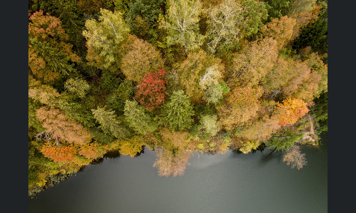 Utilizzando un drone professionale quadricottero Phantom 2 Vision Plus DJI, ha fotografato dall’alto paesaggi mozzafiato colorati dallo splendore delle foglie verdi, rosse e dorate della stagione di mezzo.