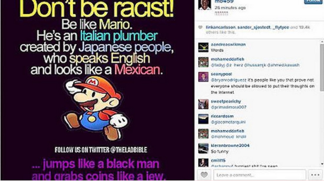 Non c’è davvero pace per Mario Balotelli (e lui non fa nulla per evitare i guai). L’ultima trovata è un post che nelle intenzioni dell’attaccante doveva essere scherzoso e che lo ha riportato, invece, al centro della scena con l’accusa di razzismo. Mario lo ha scritto nella serata di ieri su Instagram riprendendo una frase offensiva per gli ebrei: “Non essere razzista, sii come Mario (Bros ndr): uno che salta come un nero e mangia soldi come un ebreo”. La polemica si è scatenata subito, tanto che lo stesso giocatore ha rimosso il post e poi ha tentato su Twitter di ridurre la portata di quanto fatto scrivendo che la madre è ebrea. Non è stato sufficiente, però, perché i tabloid inglesi si sono scatenati occupando le prime pagine con la vicenda.