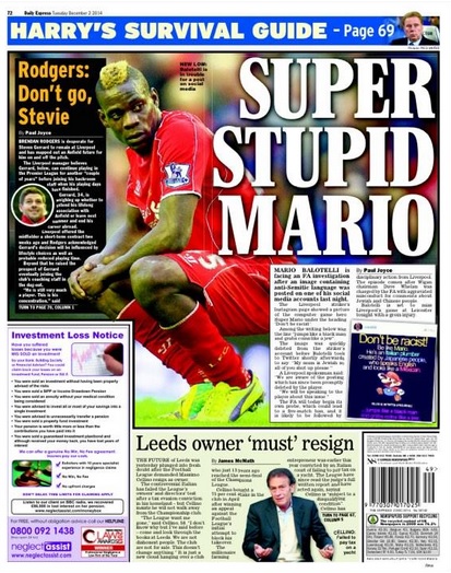 19788314Non è vero che il made in Italy non esiste più e che ormai non riusciamo a esportare le nostre eccellenze. Certo, svalutando la vecchia liretta qualche vantaggio competitivo in più lo avevamo, ma anche adesso ci difendiamo. Ai depressi della recessione, ad esempio, consigliamo una rapida rassegna stampa di oggi dei giornali inglesi. C’è l’ultima prodezza di Super Stupid Mario (copyright Daily Express) e il sorrisetto furbo di Cellino, che i club non vorrebbero più alla guida del Leeds perché accusato in Italia di frode fiscale.