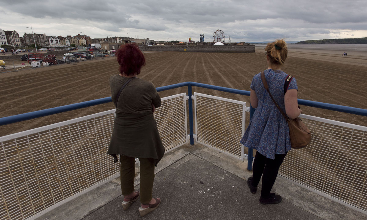 Weston-Super-Mare, Inghilterra, 20 agosto 2015. Due donne osservano Dismaland da lontano.
