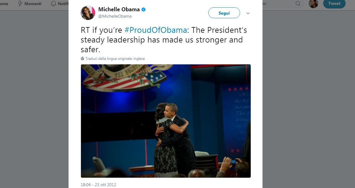 La famosa foto dell’abbraccio del 2012 quando Obama venne confermato per il secondo mandato, ma anche il contegno e il rispetto che Barack ha sempre avuto verso la moglie in ogni occasione pubblica ammirandone l’eleganza e la bellezza alle cene ufficiali o agli eventi di gala.