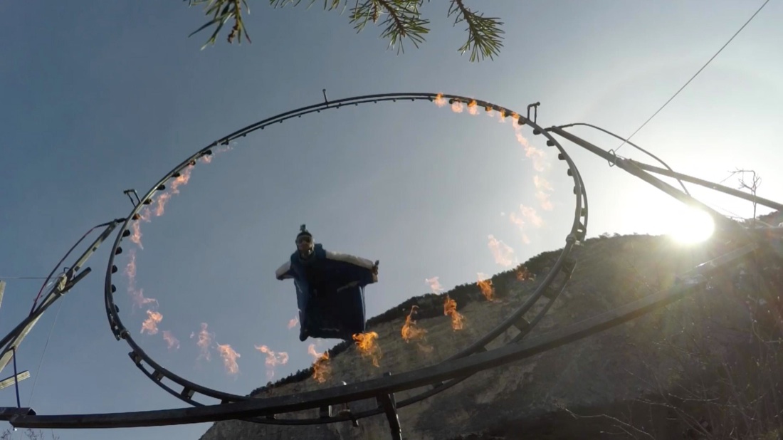 Un momento dell’impresa di Uli Emanuele che con una tuta alare ha attraversato in volo un cerchio di fuoco a 170 km/h – Bolzano, 13 maggio 2016