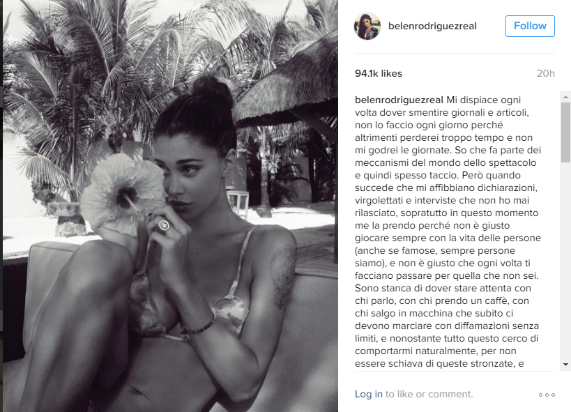 Di certo in queste ore Belén non ha risparmiato frecciatine a chi le avrebbe attribuito “dichiarazioni, virgolettati e interviste che non ho mai rilasciato”, aggiungendo, sul proprio profilo Instagram: “Soprattutto in questo momento me la prendo perché non è giusto giocare sempre con la vita delle persone (anche se famose, sempre persone siamo), e non è giusto che ogni volta ti facciamo passare per quella che non sei”.