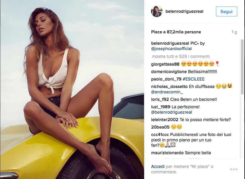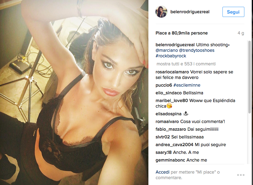 La showgirl ha voluto ringraziare a modo suo i fan per l’affetto con cui tutti commentano ogni singolo selfie che quotidianamente Belén posta e ha regalato un nudo integrale ad un pubblico social andato in delirio. Si tratta di uno scatto di Gianluca Sarago che a ora ha già 106.000 mi piace.