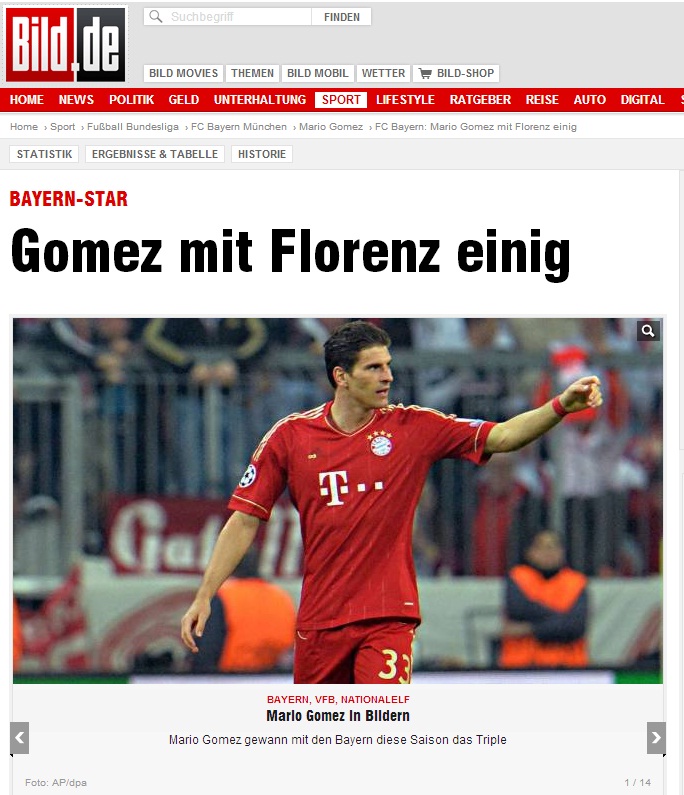 Per il quotidiano tedesco Bild è ormai fatta per il passaggio di Mario Gomez alla Fiorentina. Il giocatore è attualmente in vacanza a Ibiza e al suo ritorno il trasferimento in Italia potrebbe essere ufficializzato. L’agente del giocatore, Uli Ferber, ha spiegato allo Stuttgarter Zeitung, quali sono le priorità del suo assistito: “Non è ancora il momento di parlare di quelle che sono le preferenze di Mario, quello che è certo è che lui andrà dove sentirà di essere l’attaccante numero uno”. In Germania sono certi che la Fiorentina abbia già trovato un accordo di massima con il Bayern Monaco, Gomez prenderà il posto di Jovetic, destinato alla Juventus. Per l’attaccante originario dell’Andalusia sarebbe la prima esperienza all’estero dopo 5 anni allo Stoccarda e 4 al Bayern Monaco.