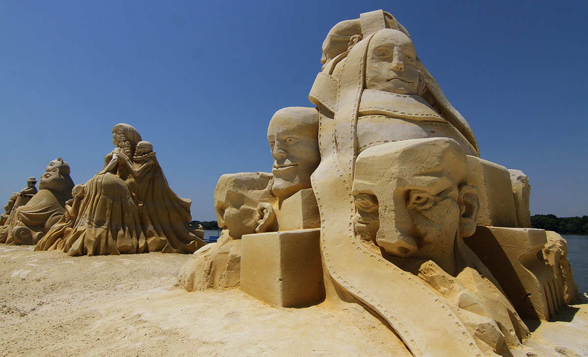 È in corso a Ruse, nel nord della Bulgaria, il locale Festival internazionale delle sculture di sabbia, quest’anno dedicato al mondo del cinema, in occasione del 120° anniversario della sua “nascita”. Sulle rive del Danubio 613 tonnellate di sabbia, modellata con acqua e argilla, hanno preso forma in 10 sculture, ciascuna alta fino a due metri, create da altrettanti artisti provenienti da 7 diversi Paesi (Bulgaria, Russia, Giappone, Repubblica Ceca, Lituania, Lettonia e Ucraina) e raffiguranti celebri star e altrettanto noti personaggi di fantasia che hanno fatto la storia della settima arte, da Marilyn Monroe a Spiderman, da Charlie Chaplin a Indiana Jones…