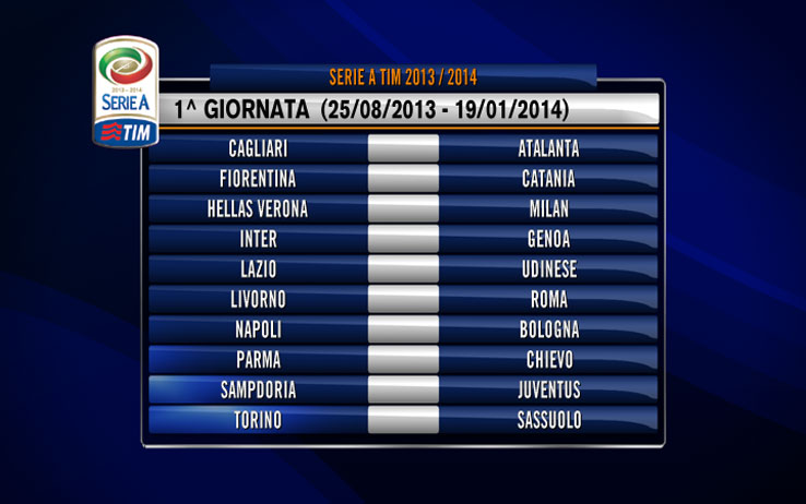 Si apre il sipario sulla serie A 2013/2014. Negli studi di Sky la presentazione del calendario della nuova stagione che inizierà il prossimo 25 agosto e si concluderà i il 18 maggio del prossimo anno. A differenza del passato nessuna testa di serie e criteri di compilazione per cui nei turni infrasettimanali non si possono incontrare Inter, Juventus, Milan, Napoli e Roma e svolgersi i derby di Genova, Roma, Torino e Verona.
