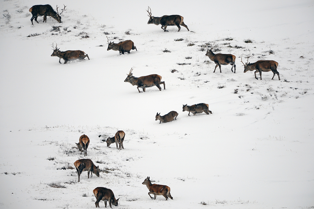 Gli animali selvatici alla ricerca di cibo nel paesaggio innevato delle Highlands scozzesi
