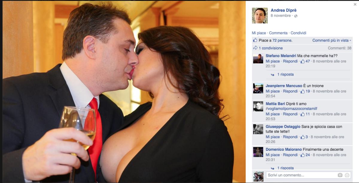 L’idillio dipreista continua sulla falsa riga del rapporto con Sara Tommasi, tra baci alcolici, sguardi vuoti, dichiarazioni d’intenti e selfie subito condivisi su Facebook, perchè in fondo il motto della più trash tra le figure partorite dal web pare essere: “Bene o male, ma basta che si parli di me e si faccia clic sui social”.