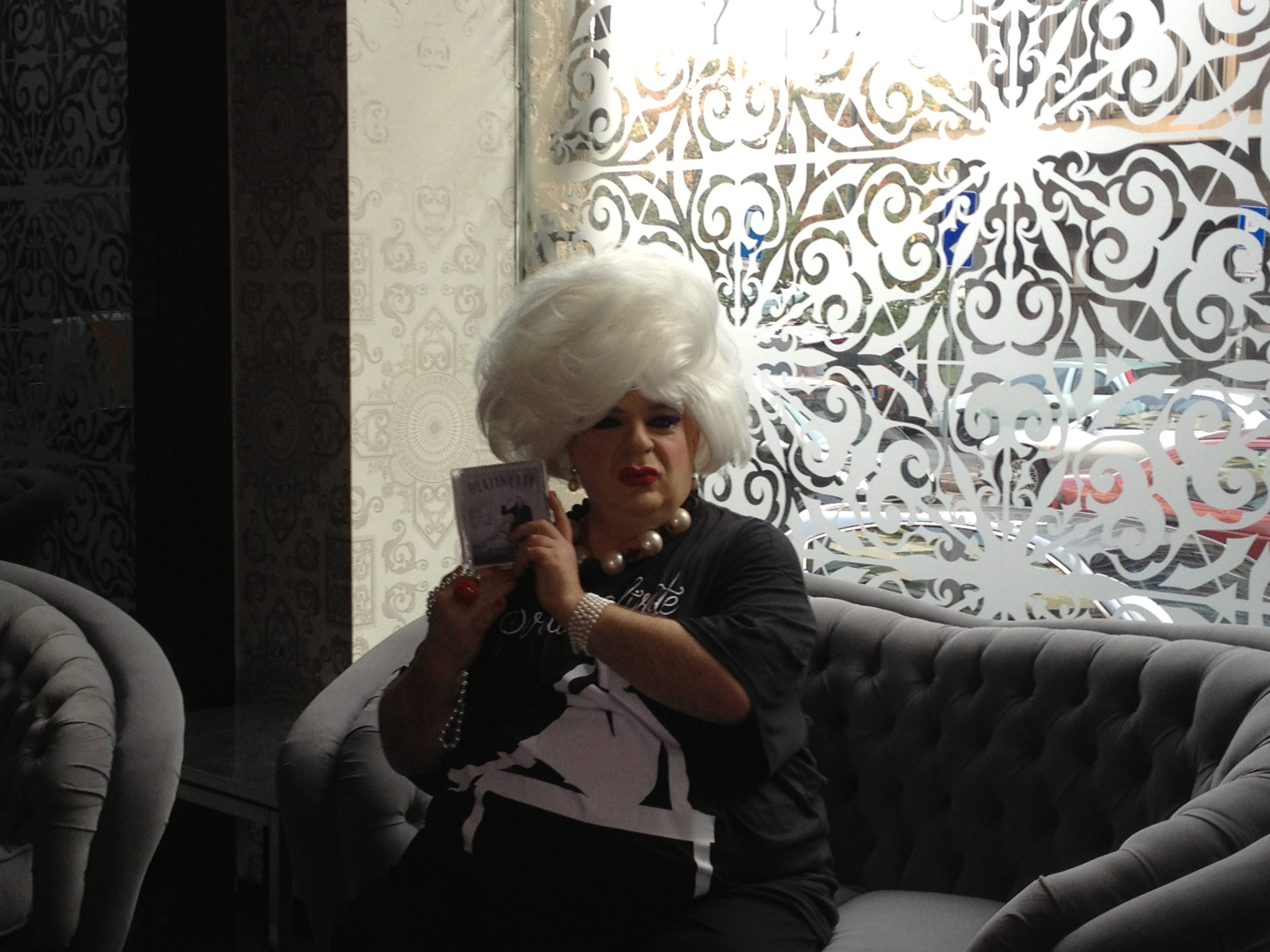 Quella ritratta in copertina è una Platinette che mostra gambe bellissime e un décolleté appena pronunciato che spunta da un tailleur nero…