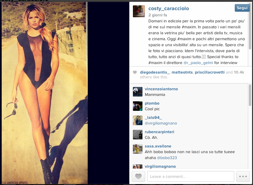 Se sul bancone di Striscia la Notizia le veline, per contratto, devono essere icona stessa della bellezza acqua e sapone quando ne scendono si scatenano. E’ successo a tutte: da Elisabetta Canalis a Melissa Satta per finire con Costanza Caracciolo, la bionda ex velina siciliana che dopo aver “appeso gli stacchetti al chiodo” ha tirato fuori sex appeal e grinta da leonessa. A 24 anni Coco ha posato per un sexy servizio pubblicato sul numero in edicola di Maxim e si è aperta proprio su tutto, a partire dal suo rapporto con gli uomini e con il sesso.