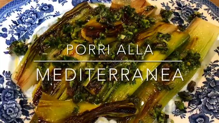 Procedimento – Mondate i porri eliminando l’ultima parte verde e le radici. Sfogliate la prima foglia poi lavateli e divideteli a metà per il senso della lunghezza. Scaldate almeno 4 cucchiai di olio extravergine di oliva in una padella. Mette ad ammollare l’uva passa in un po’ d’acqua tiepida. Passate in padella a fiamma vivace i porri prima da una parte e poi dall’altra in modo che si abbrustoliscano un po’, poi aggiungete un po’ d’acqua, incoperchiate e ora a fiamma moderata andate a cottura. Ci vorranno non più di dieci minuti. Nel frattempo fate un trito con l’aglio, il prezzemolo, i pistacchi, l’uva passa ben strizzata che condirete con olio extravergine di oliva sale e un po’ di pepe. In una ciotola mescolate stracchino e yogurt greco, l’erba cipollina (se è fresca tritatela finemente), il succo di limone (mettetene secondo vostro gusto, ma un po’ di acidità è gradevole) aggiustate di pepe. Prendete i piatti di portata e stendete sul fondo un po’ di crema di formaggio e yogurt, adagiatevi sopra tre mezzi porri, aggiustate di sale e poi conditeli con il battuto, altro olio extravergine e qualche goccia di miele.