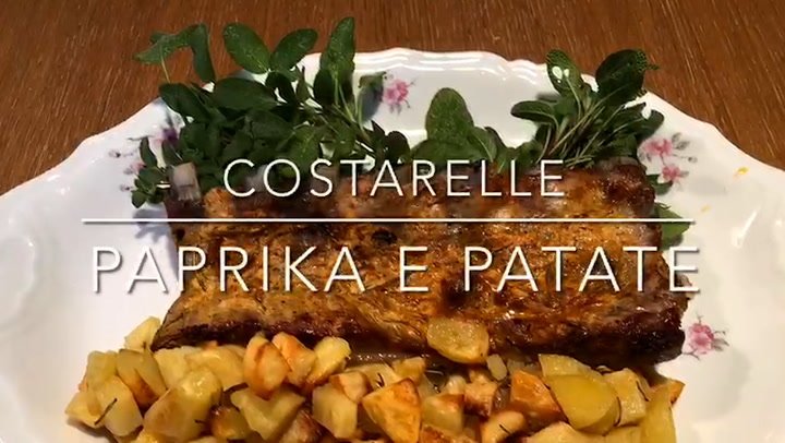Procedimento – Sbucciate le patate fatele a tocchetti di circa mezzo centimetro, ora prendete le costarelle e adagiatale su un foglio o di carta forno o di allumino e conditele da entrambe le parti con tutti gli aromi serbando un po’ di rosmarino, pennellatele con la senape e la paprika, un filo di extravergine e chiudetele nel cartoccio. Sistemate un altro foglio di carta forno sulla placca del forno e adagiatevi le patate che condirete con l’aglione, il rosmarino, il sale, il pepe e generoso olio extravergine. Sistemate sulla placca anche il cartoccio di costarelle. Infornate a 210 gradi per circa 50 minuti avendo cura di rigirare di quando in quando le patate.
