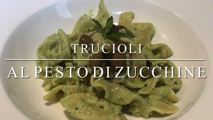 Procedimento – Mette a bollire una pentola capiente di acqua. Nel frattempo dopo averle nettate grattugiate le zucchine con una mandolina, salatele e mettetele a scolare l’acqua di vegetazione in un colino. Quando le zucchine hanno perduto la loro acqua, buttate la pasta e nel tempo di cottura con l’aiuto di un mixer ad immersione montate il pesto frullando zucchine, menta, basilico, due cucchiai di formaggio, i pinoli e tre quarti dell’extravergine fino a ottenere un pesto spumoso. Scolate la pasta e conditela con le taggiasche, l’olio rimasto, il pesto e il formaggio, aggiustate di pepe e servite.