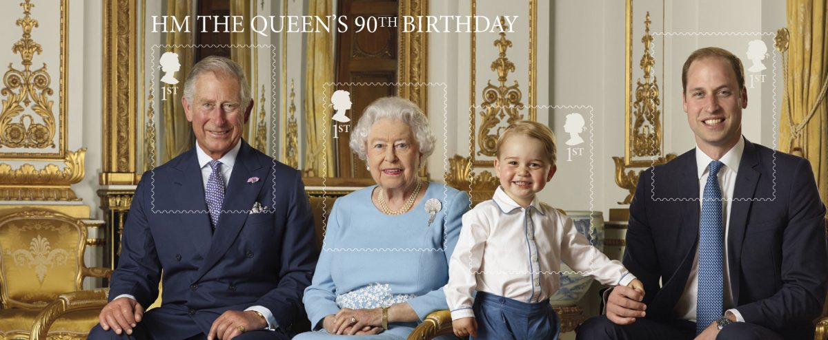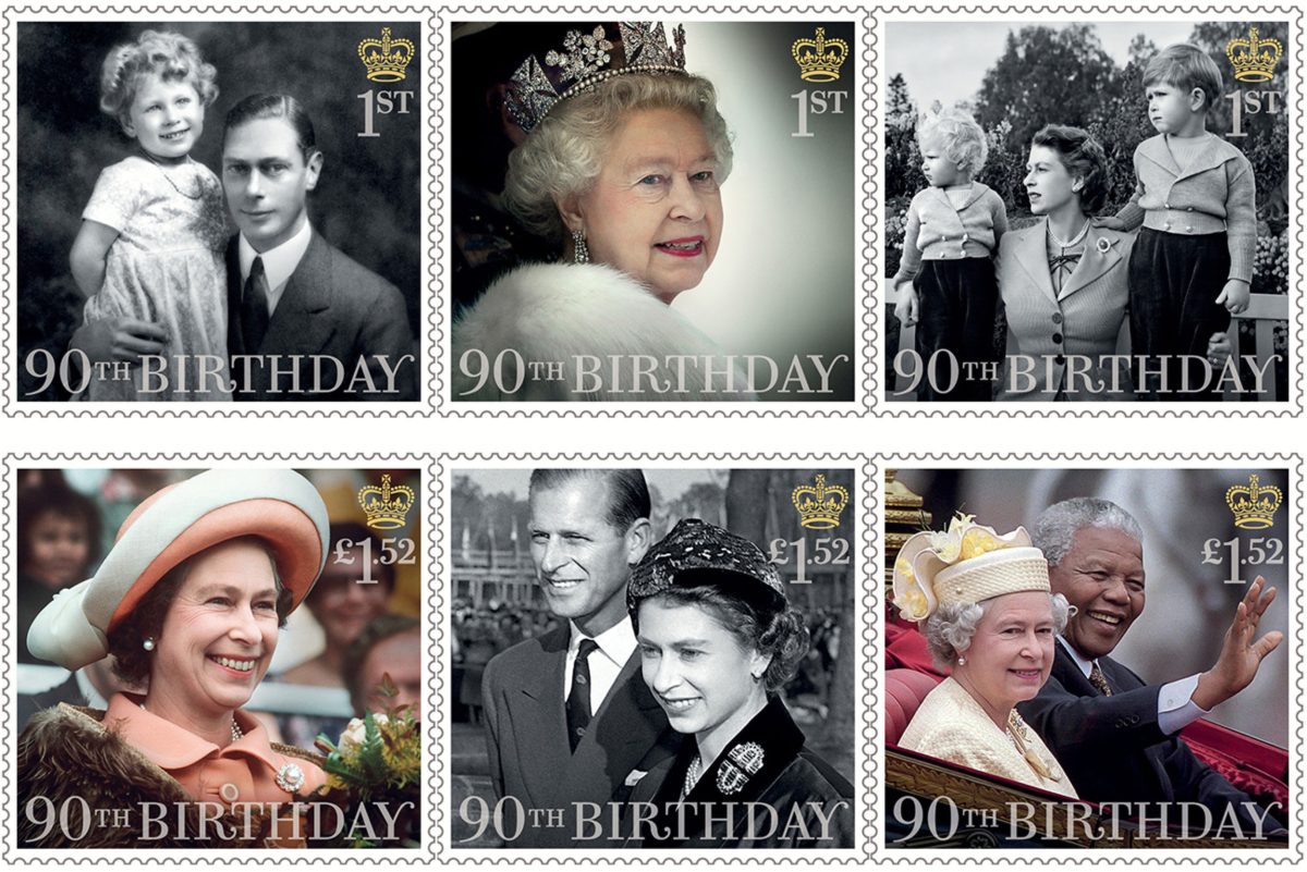 I sei francobolli rilasciati in occasione dei 90 anni della Regina
