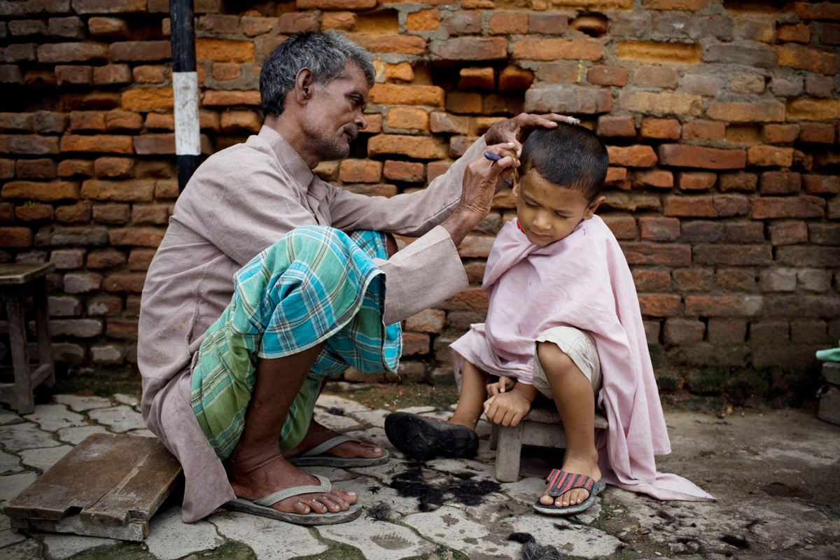 Alcuni barbieri migrati dall’India al lavoro lungo una strada di Kathmandu, in Nepal. Questi “saloni open air” offrono agli abitanti più poveri della città il modo più economico per farsi tagliare i capelli.