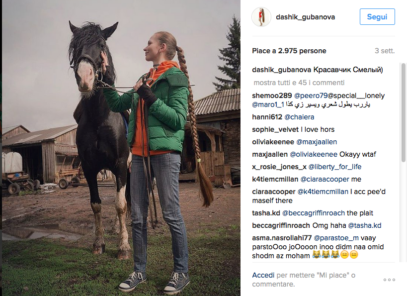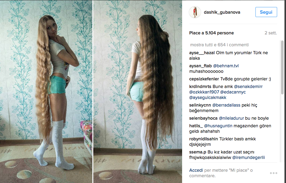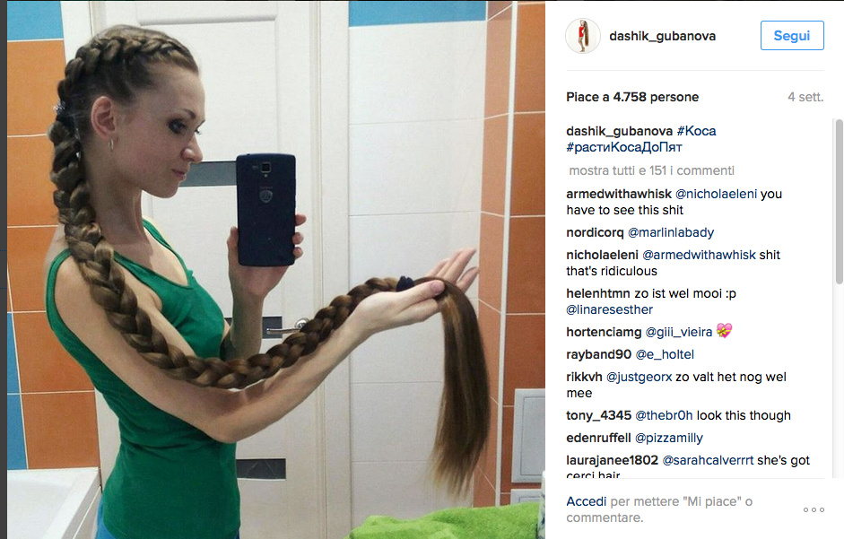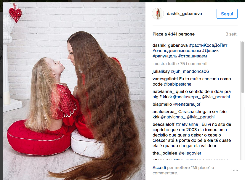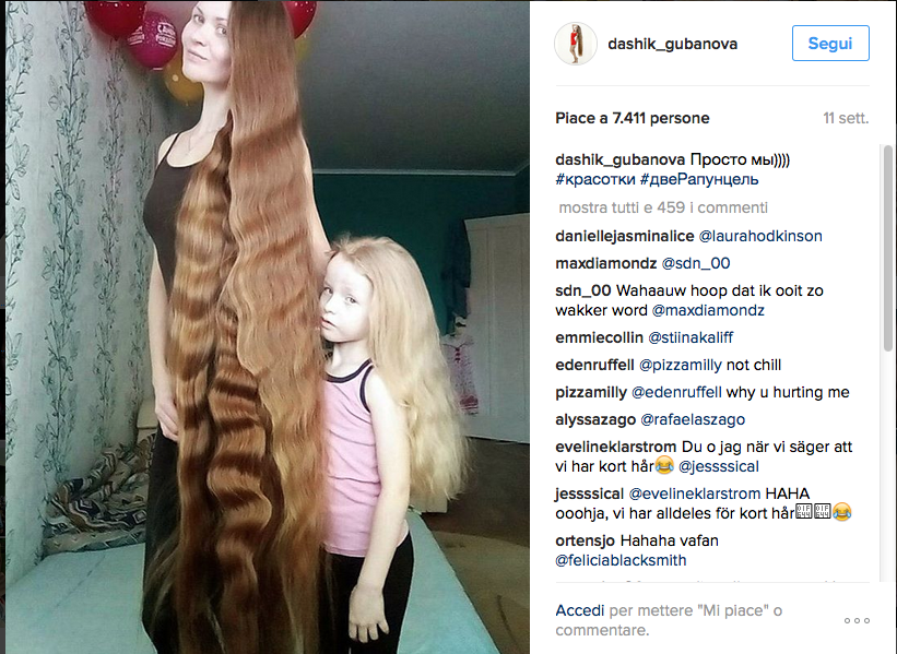 Si tratta di una giovane mamma russa che da 13 anni non taglia i capelli e che, grazie alla sua chioma infinita, è diventata una star Instagram da 104.000 follower.