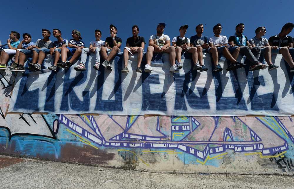 27 giugno 2014. Alcuni ragazzi espongono uno strisicone con la scritta "Ciro Eroe" durante i funerali di Ciro Esposito, nel corso della sua cerimonia funebre in piazza Grandi Eventi a Scampia, Napoli.