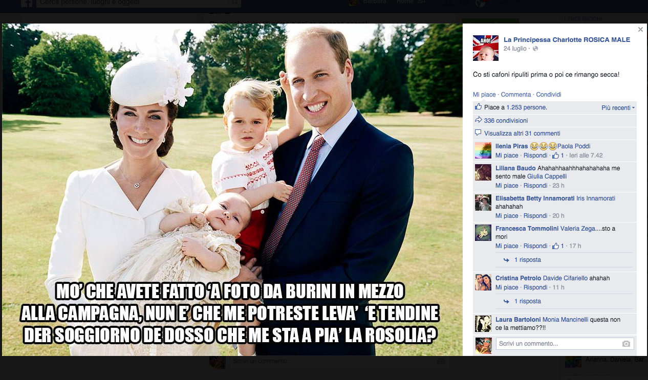 In pochi giorni oltre diciottomila persone hanno messo “Mi piace” sulla pagina Facebook “La principessa Charlotte rosica male“, nulla in confronto agli oltre 280.000 ottenuti dal fratello maggiore George che con il suo “Baby George ti disprezza” al grido “Poracci” è diventato un fenomeno del web.