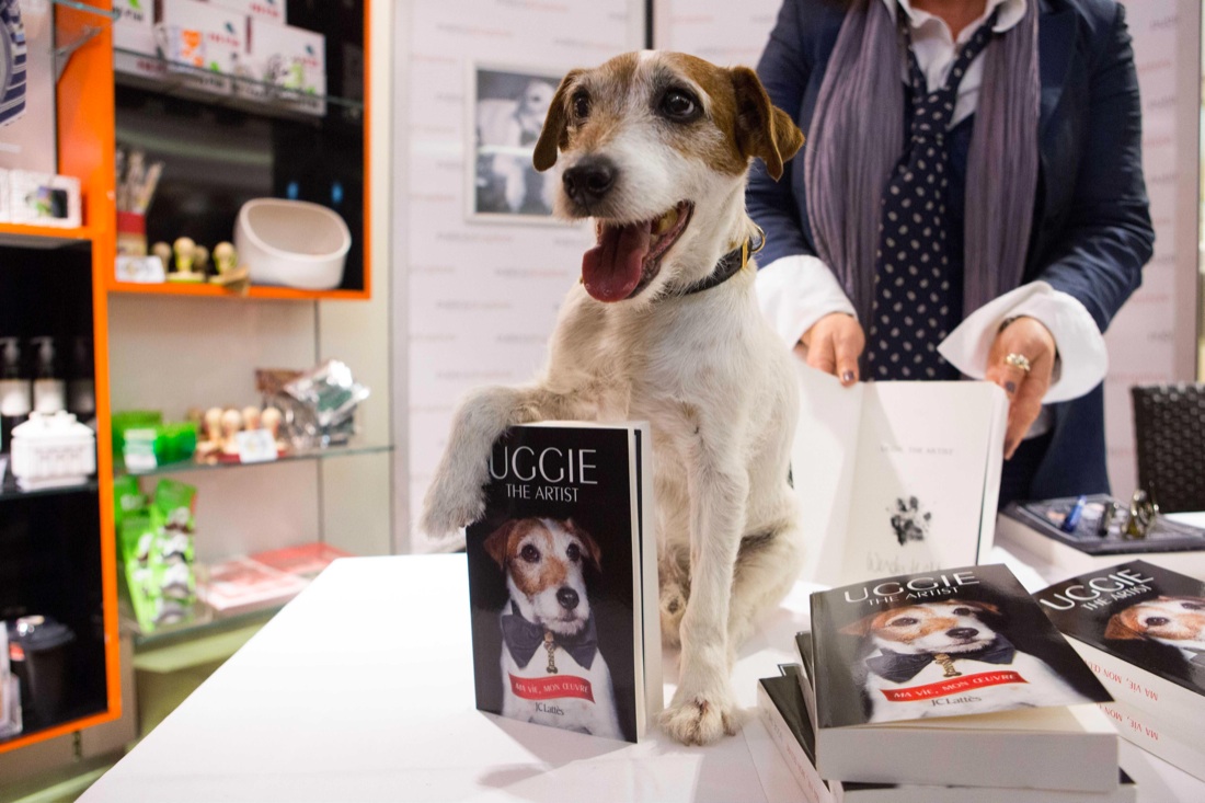 Il famoso cane Uggie che ha “recitato” nel film The Artist durante la presentazione del “suo” libro a Parigi nel 2012