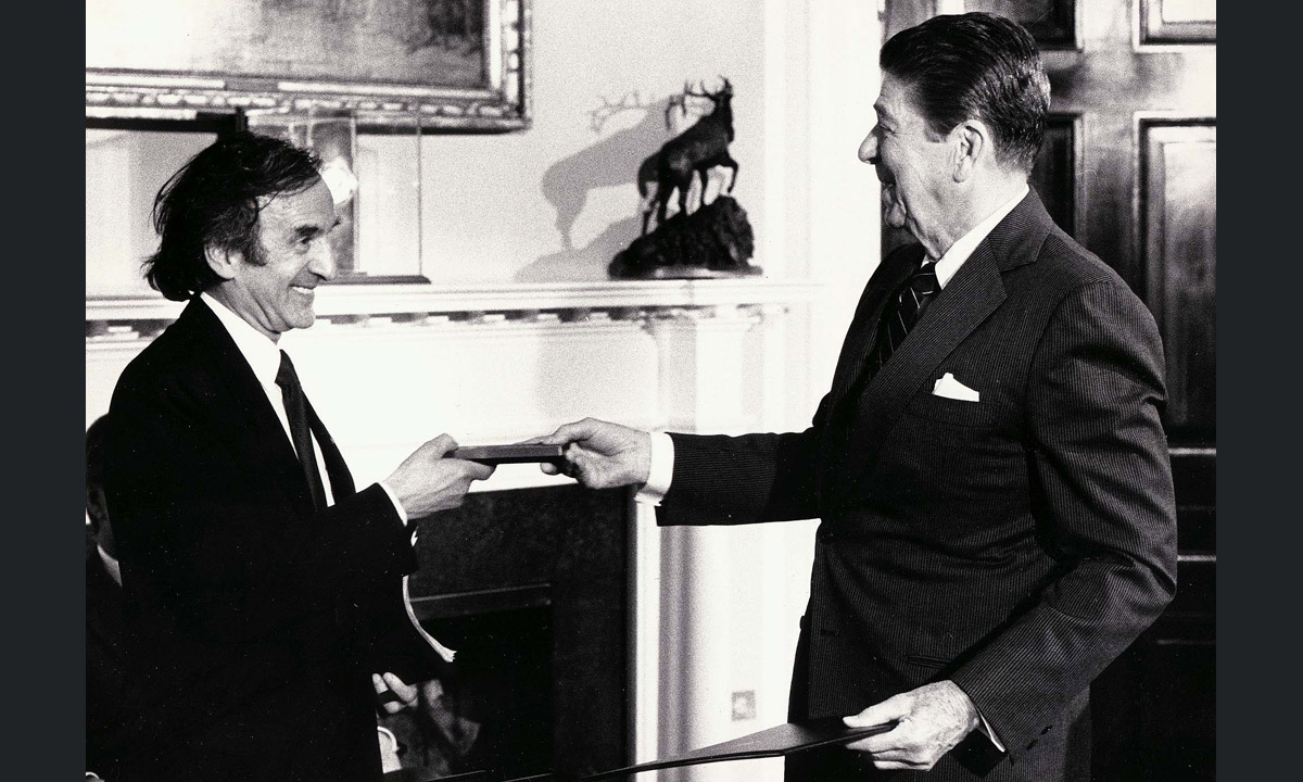 14 aprile 1985. Elie Wiesel riceve una Medaglia d’onore del Congresso degli Stati Uniti dalle mani dell’allora Presidente Ronald Reagan, alla Casa Bianca a Washington, DC.