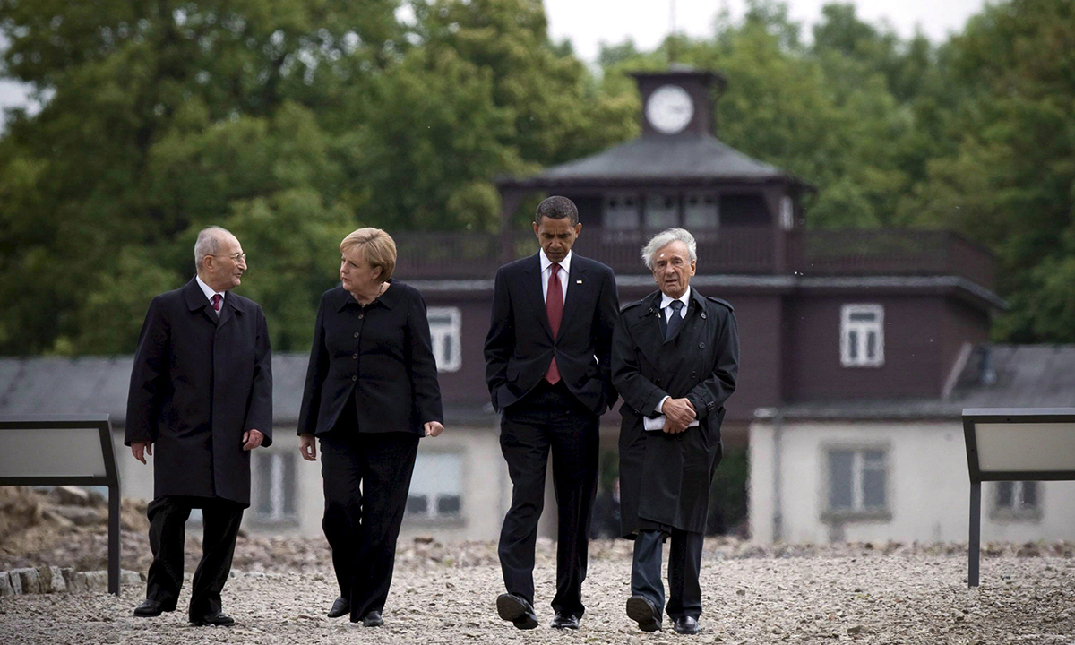 5 giugno 2009. Elie Wiesel con Barack Obama, Angela Merkel e un altro sopravvissuto all’olocausto di nome Bertrand Herzin visita al campo di concentramento di Buchenwals, in Germania.
