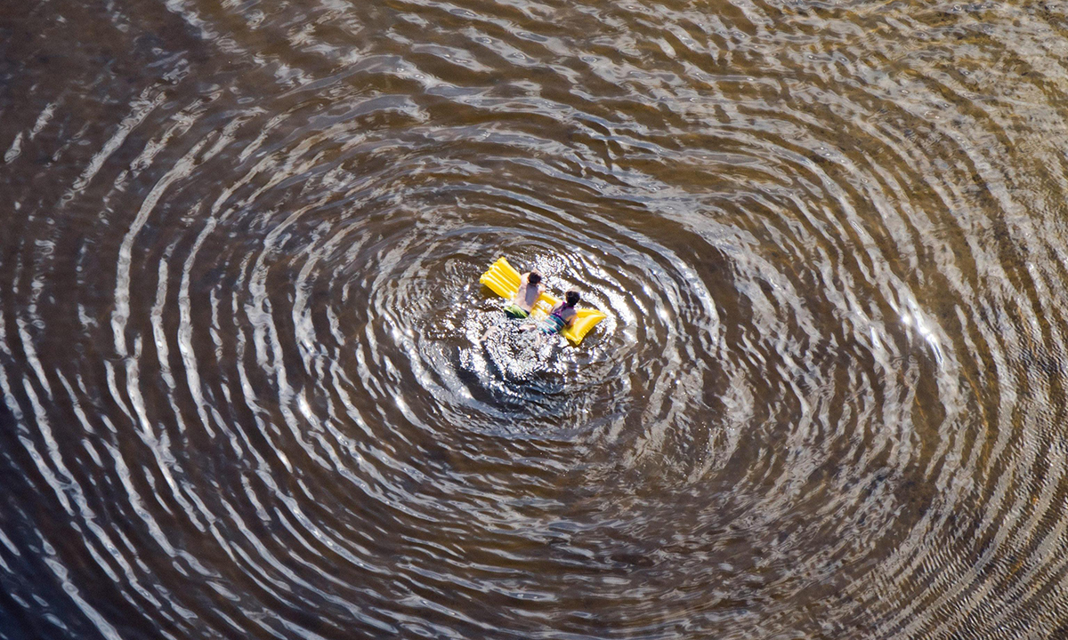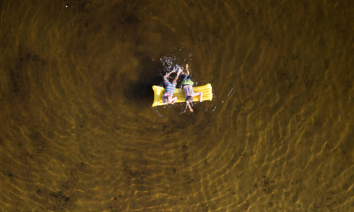 18 luglio 2016. Due ragazzi su un materassino gonfiabile sul lago di Altwarmbüchen presso Hannover, nella Bassa Sassonia, Germania.