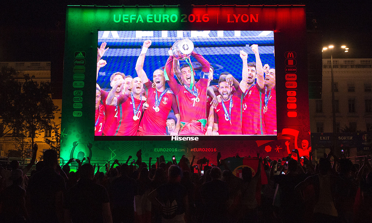 10 luglio 2016. Portogallo – Francia : 1 – 0 (Finale). I giocatori del Portogallo festeggiano il gol della vittoria allo Stade de France di Saint-Denis, nelle immagini proiettate su un maxischermo installato nella zona tifosi di Lione.