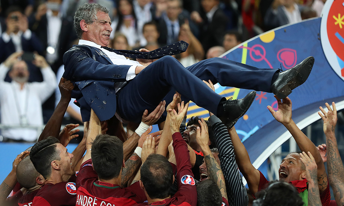 10 luglio 2016. Portogallo – Francia : 1 – 0 (Finale). I giocatori del Portogallo portano in trionfo l’allenatore Fernando Santos, festeggiando la vittoria allo Stade de France di Saint-Denis, a nord di Parigi.