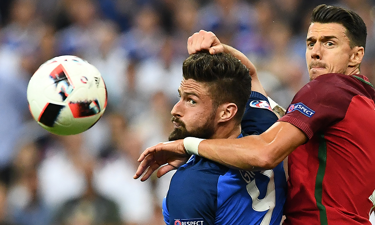 10 luglio 2016. Portogallo – Francia : 1 – 0 (Finale). Olivier Giroud (Francia ) in azione contro Fonte (Portogallo), allo Stade de France di Saint-Denis, a nord di Parigi.