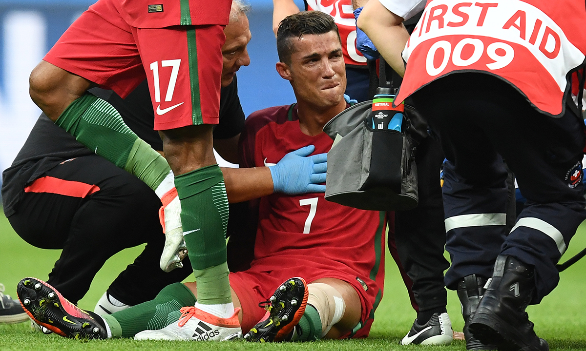 10 luglio 2016. Portogallo – Francia : 1 – 0 (Finale). Cristiano Ronaldo soccorso in campo, dopo essersi infortunato a pochi minuti dall’inizio della finale, allo Stade de France di Saint-Denis, a nord di Parigi.