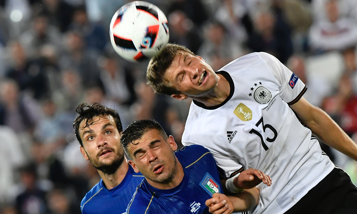 2 luglio 2016. Germania – Italia : 1 : 1 > Rigori 6 : 5 (Quarti di finale). Florenzi ed Hector si contendono il pallone in un contrasto aereo.