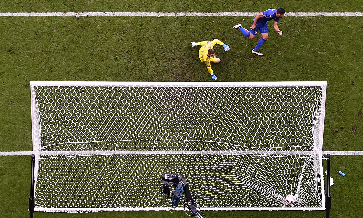 27 giugno 2016. Italia – Spagna : 2 – 0 (Ottavi). Gianluigi Buffon festeggia la vittoria arrampicandosi sulla porta, allo Stade de France di Saint-Denis, presso Parigi.