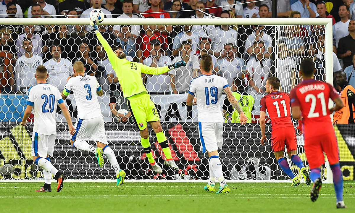 20 giugno 2016. Slovacchia – Inghilterra : 0 – 0 (Gruppo B). Jamie Vardy dell’Inghilterra vs Peter Pekarik e Juraj Kucka della Slovacchia, allo stadio Geoffroy-Guichard di Saint-Etienne.