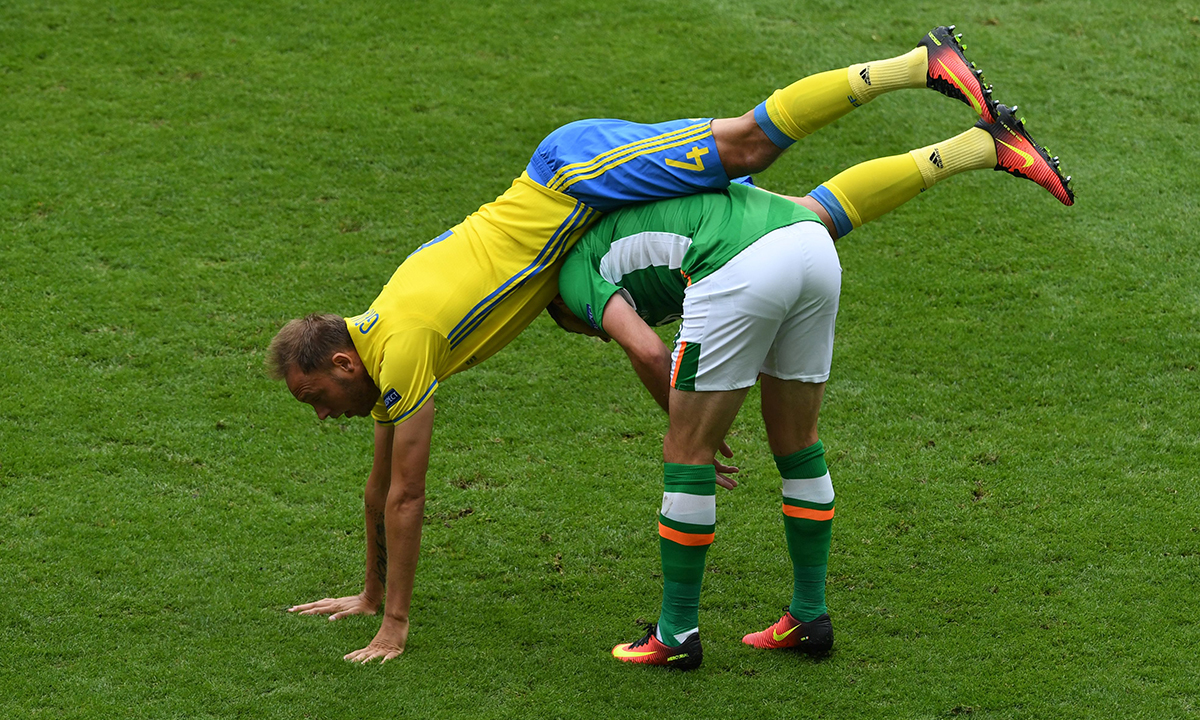 13 giugno 2016. Irlanda – Svezia : 1 – 1 (Gruppo E). L’irlandese Shane Long e lo svedese Andreas Granqvist in campo allo Stade de France di Saint-Denis, vicino a Parigi.