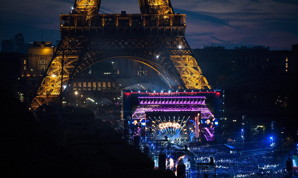 9 giugno 2016. In una foto scattata dalla Torre Eiffel, un momento del concerto di apertura di Euro 2016: David Guetta in Champs de Mars.
