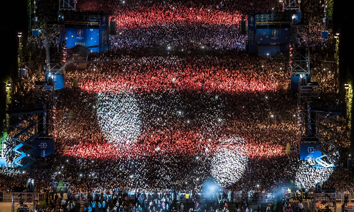 26 giugno 2016. Ungheria – Belgio : 0 – 4 (Ottavi). I tifosi del Belgio festeggiano la vittoria davanti a un megaschermo allestito nella zona tifosi presso la Tour Eiffel, a Parigi.