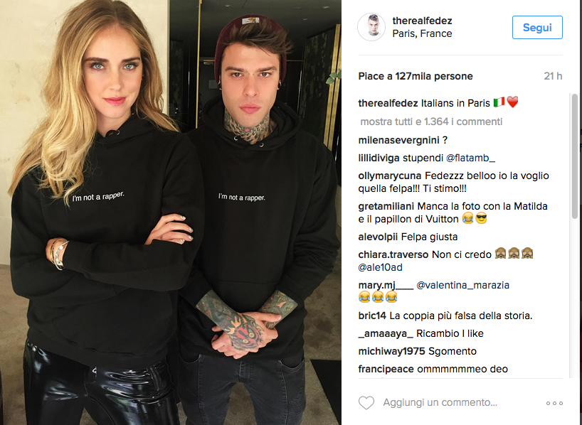 “I’m not a rapper” recita la maglia nera con scritta bianca indossata dal rapper e dalla fashion blogger del momento nella prima foto ufficiale che riprende insieme Fedez e Chiara Ferragni due ragazzi che paiono accumunati dalla capacità di trasformare in oro tutto quello che toccano.