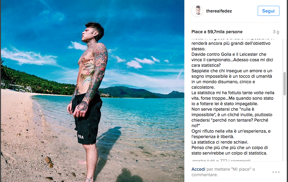 La liason, però, non è durata tanto che Fedez ha rifatto le valigie ed è tornato solo soletto in Italia scrivendo sui suoi social: “Valigia fatta si torna. Settimana bella pesante, non vedo l’ora di tornare in Italia. Viva donne italiane tutta la vita. Un giorno ve la racconterò perché fa super ridere, non so se si tratta di vere o proprie differenze culturali o di psicosi, opterei per la seconda”.