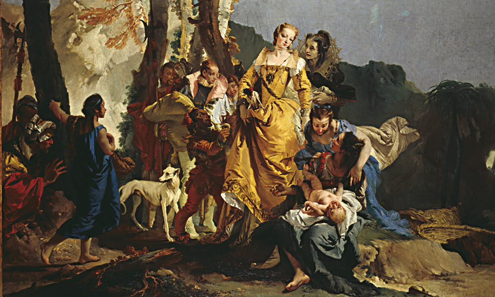 Da una parte una grande rappresentazione di un episodio biblico, Mosé salvato dalle acque, oggi conservata al museo di Edimburgo; dall’altra un Alabardiere, un vero gioiello che fa parte del museo Marella e Gianni Agnelli, a Torino. In teoria, non ci fossero delle inconfutabili prove documentarie, sarebbe difficile anche per l’occhio acuto di un detective sospettare che queste due tele fossero una cosa sola. Troppo diverse sono le proporzioni delle figure, con l’alabardiere che dovrebbe fare da comprimario e che invece giganteggia rispetto ai veri protagonisti dell’episodio biblico. Inoltre Tiepolo, per dipingere quest’opera, si era ispirato a un prototipo realizzato quasi due secoli prima da Paolo Veronese, e oggi conservato a Digione: in quel “modello” attorno al Mosé bambino appena salvato dalle acque del Nilo non c’era nessuna figura a fungere da presidio armato. Quell’aggiunta era, insomma, tutta farina del sacco di Giambattista Tiepolo, come documenta, senza possibilità di appello, una copia antica del quadro, oggi attribuita al figlio stesso di Tiepolo, Giandomenico, e conservata a Stoccarda. La notizia è che dal 17 novembre (fino al 1° aprile 2013) tutti i pezzi di questo affascinante puzzle verranno radunati al Castello di Udine, per una mostra (dal titolo I colori della seduzione. Giambattista Tiepolo e Paolo Veronese, con opere su tela dei due maestri oltre a un gruppo di loro fogli prestati da diversi musei internazionali, informazioni su www.udinecultura.it ) che al centro vedrà ovviamente la spettacolare riunificazione, dentro un’unica cornice, del capolavoro smembrato.