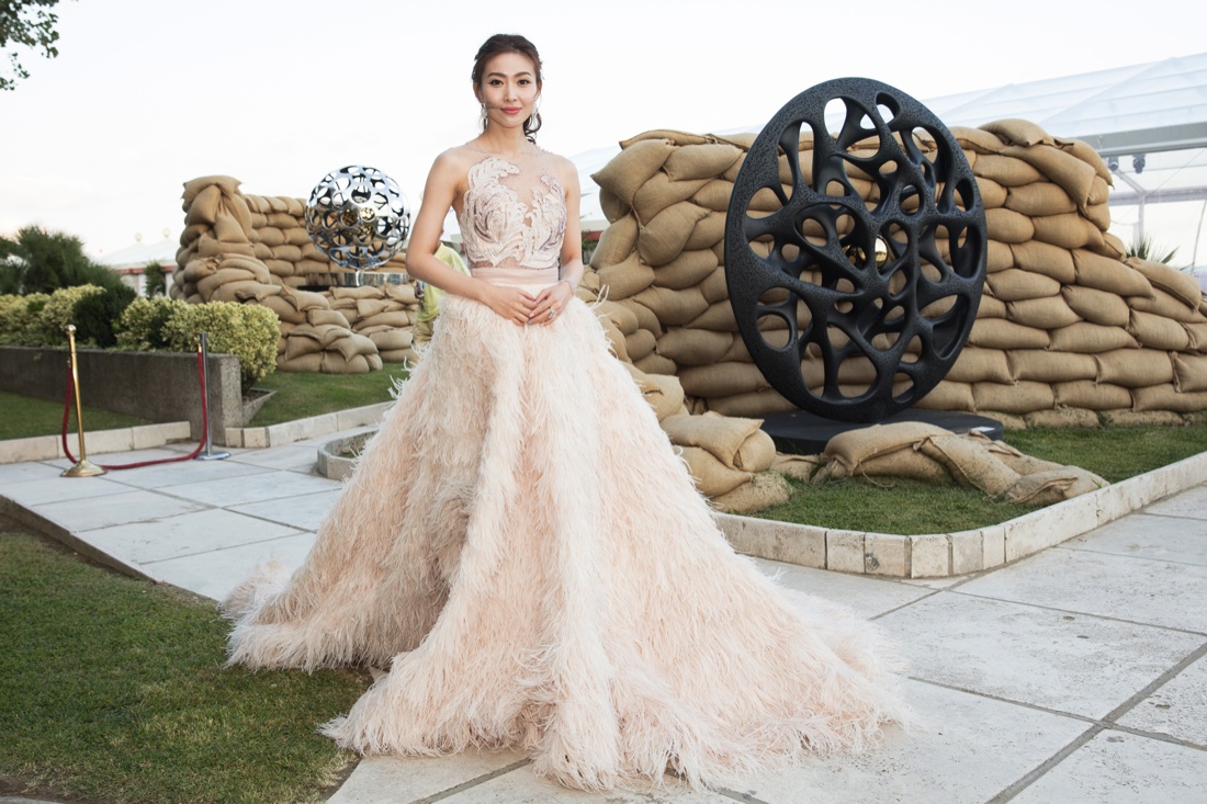 L’attrice Zhou Zhi davanti a una delle installazioni di Gianfranco Meggiato, Il Giardino delle Muse silenti, 2017. Venezia, Hotel Excelsior, 8 settembre 2017