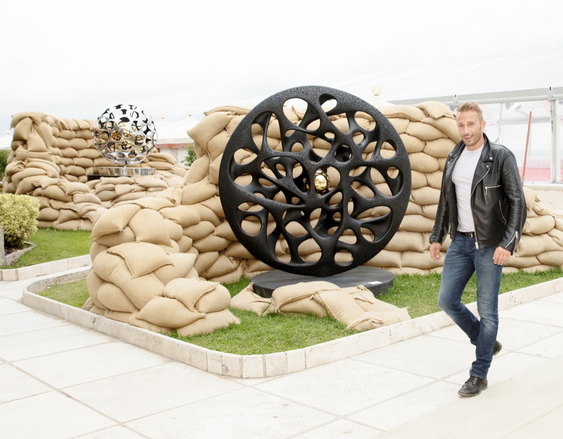 Matthias Schoenaerts davanti a una delle installazioni di Gianfranco Meggiato, Il Giardino delle Muse silenti, 2017. Venezia, Hotel Excelsior, 6 settembre 2017